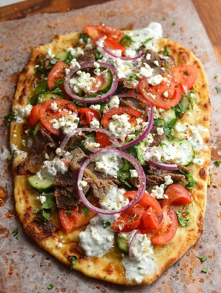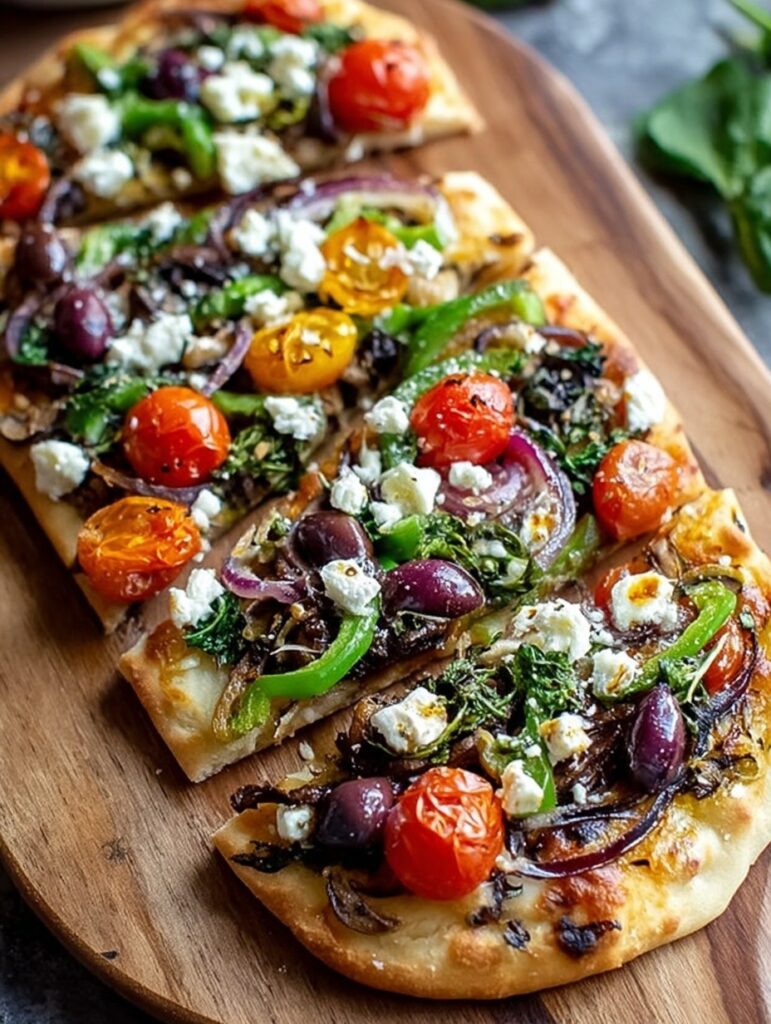 This colorful flatbread is loaded with Mediterranean flavors! Hummus, roasted vegetables, feta cheese, and olives create a healthy yet incredibly satisfying meal. It’s my go-to when I want something light but flavorful.