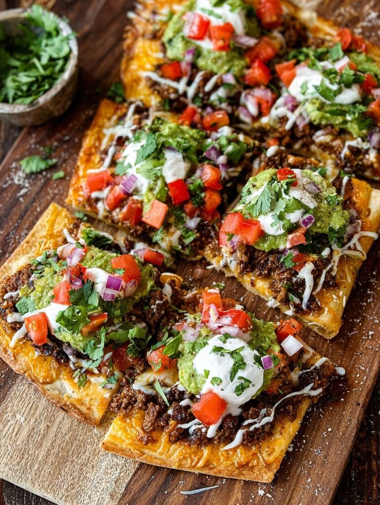 All the flavors of taco night in flatbread form! Seasoned ground beef, cheese, and all your favorite toppings make this a kid-friendly winner.