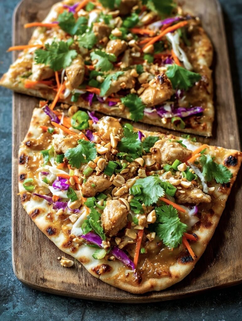 This Asian-inspired flatbread is bursting with bold flavors! Creamy peanut sauce, chicken, crunchy vegetables, and cilantro make it absolutely irresistible.