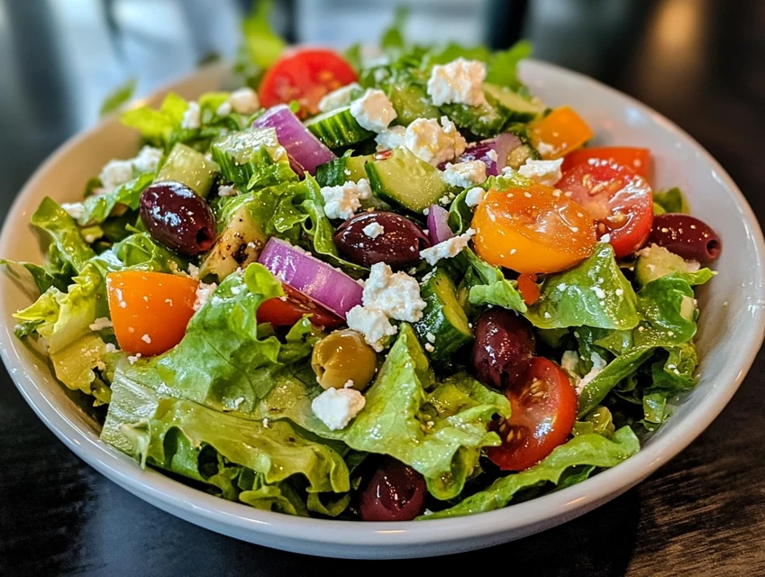 A vibrant and refreshing salad featuring fresh vegetables, tangy feta cheese, and a zesty dressing, perfect for a light meal or side dish.