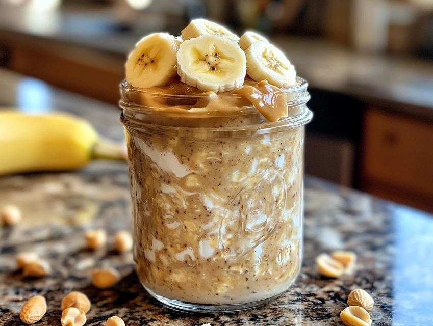 A delicious and nutritious breakfast option combining rolled oats, creamy peanut butter, and ripe bananas, prepared the night before for a quick morning meal.
