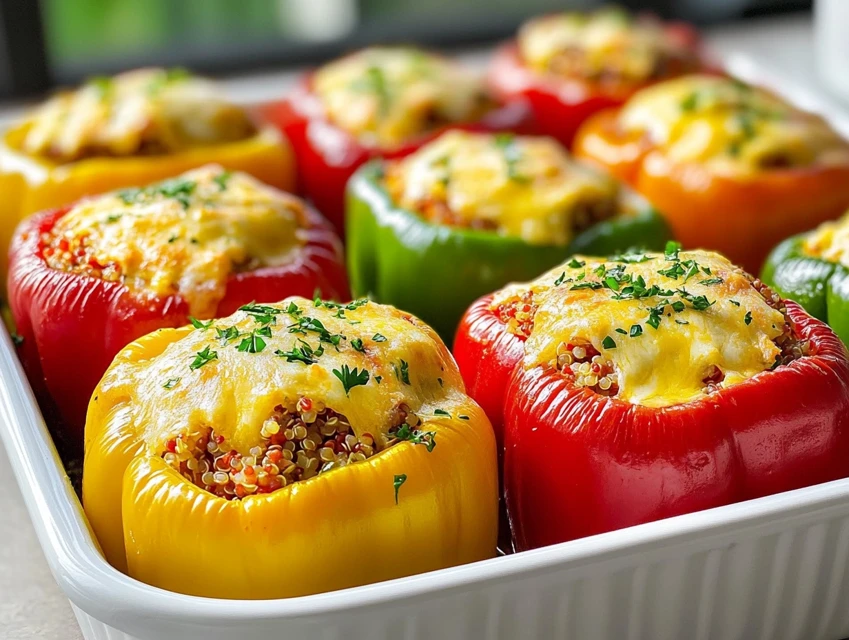 A nutritious and delicious meal featuring vibrant bell peppers stuffed with a hearty mixture of quinoa, ground turkey, and spices.