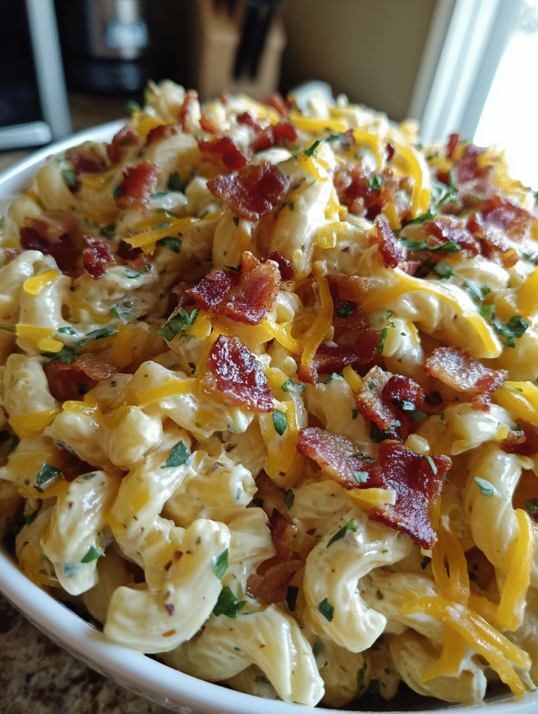 Because everything’s better with bacon! This creamy ranch pasta salad loaded with bacon and cheddar is pure comfort food perfection.