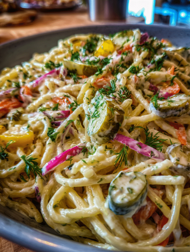 13. Creamy Dill Pickle Pasta Salad