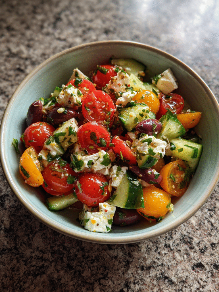 Mediterranean flavors shine in this bright, fresh pasta salad! Tangy feta, kalamata olives, cucumbers, and a lemon-herb dressing make this feel like a Greek vacation.