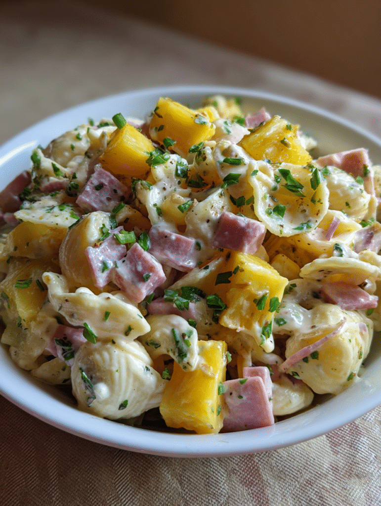 - In a large bowl, combine pasta, ham, pineapple, bell pepper, green onions, and carrots.