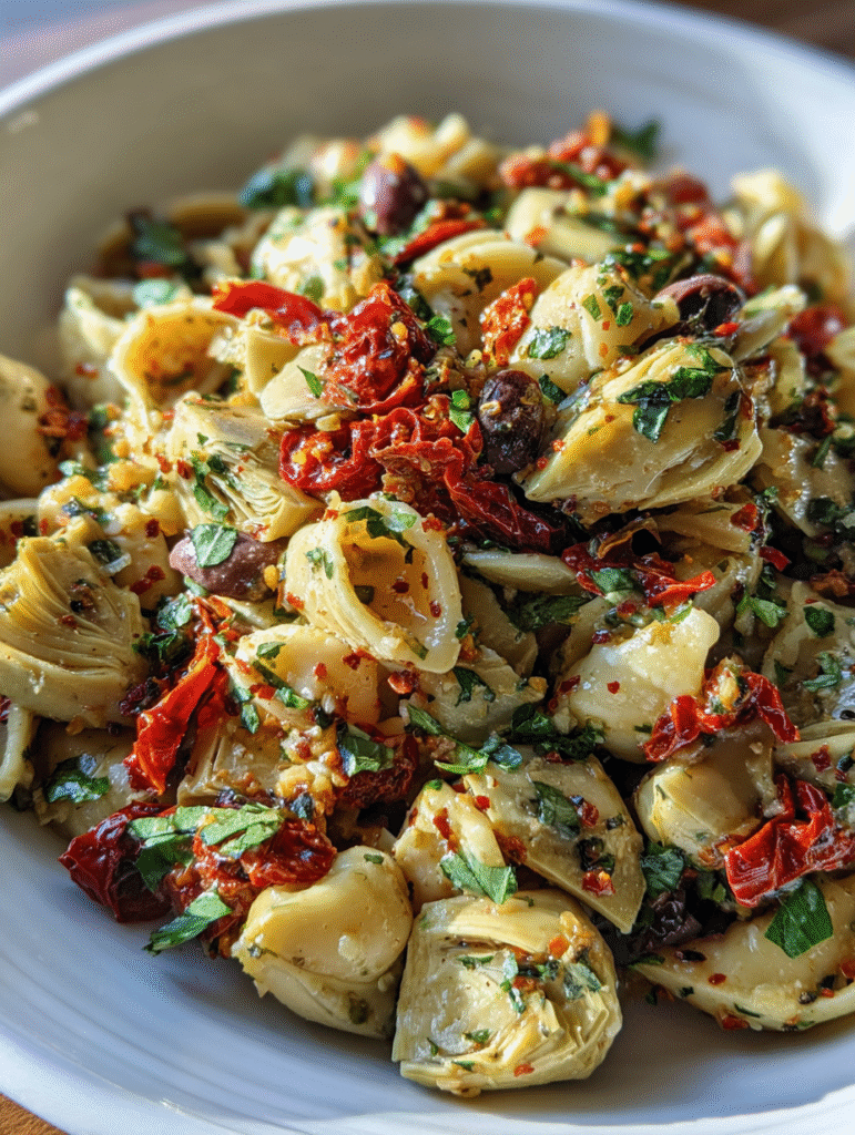 Sun-dried tomatoes, artichokes, and olives bring bold Mediterranean flavors to this colorful pasta salad. It’s tangy, savory, and absolutely delicious!