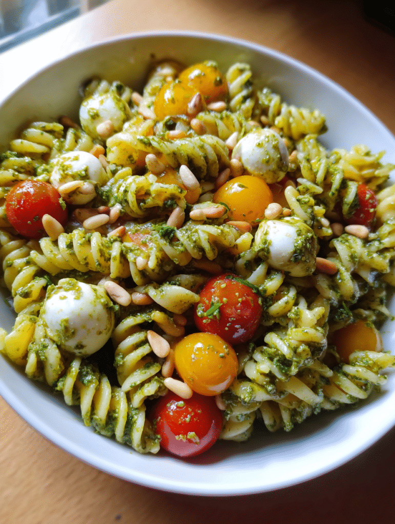 Fresh basil pesto brings vibrant flavor to this simple but stunning pasta salad. Cherry tomatoes and mozzarella make it fresh and colorful!